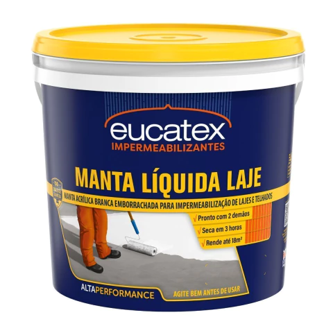 Eucatex Manta Liquida é uma manta acrílica elastomérica para aplicação à frio, que forma uma membrana elástica impermeável, resistente a ação de intempéries e contribui para a redução de temperaturas em lajes e telhados atuando como isolante térmico.